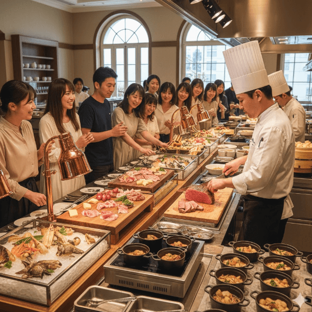 • ライブキッチン: シェフがその場で調理を行う様子を視覚的に楽しみ、出来立て熱々の料理がそのまま提供されるため、ブッフェにありがちな作り置きのイメージを払拭し、顧客満足度が格段に向上します。