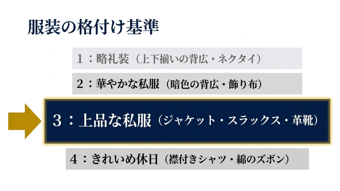 | スマートカジュアル | 清潔感のある上品な私服 | ジャケット、スラックス、革靴 |