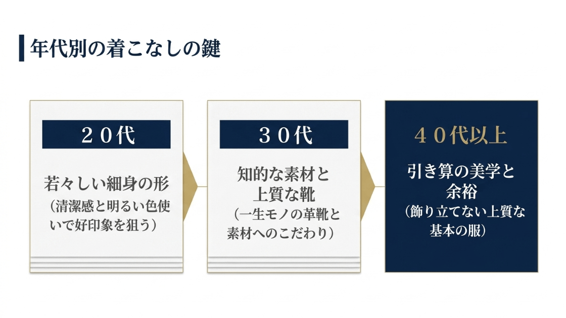 年齢を重ねると、顔つきや体型はもちろんですが、周囲から期待される役割も変わってくるものです。20代の若々しい爽やかさと、40代の落ち着いた貫禄では、同じネイビーのジャケットを着ていても似合うニュアンスが異なります。