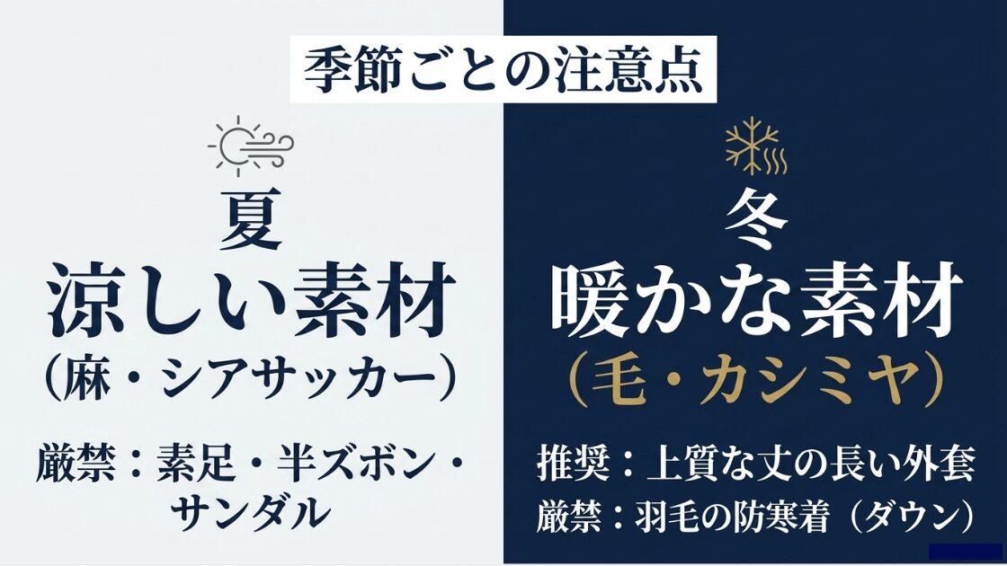 特に夏や冬の季節に合わせた素材選びや、ジーンズがどこまで許容されるのかといった境界線は判断が難しいところです。