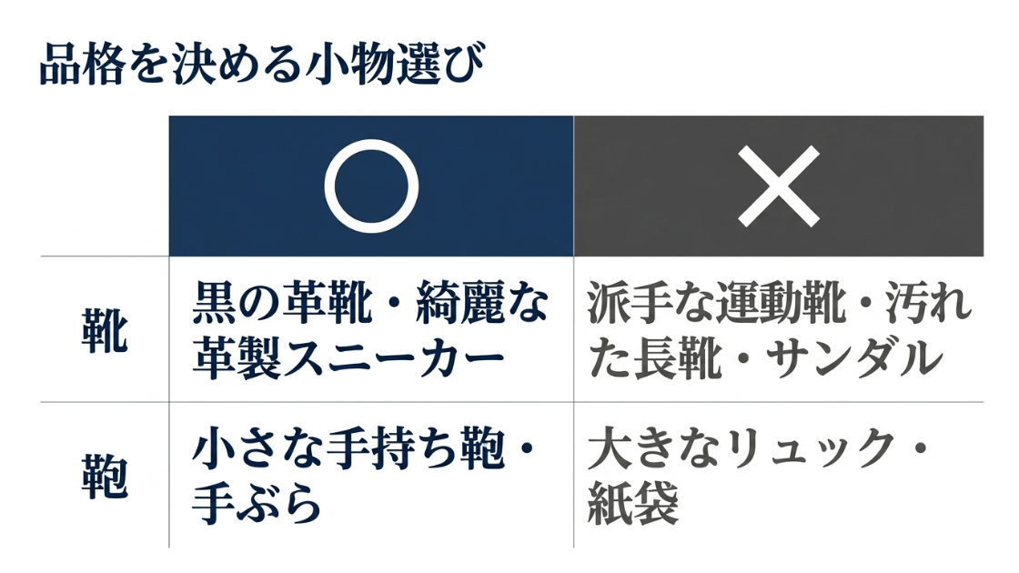 | 靴 | プレーントゥ、ローファー、レザースニーカー | サンダル、運動靴、汚れたブーツ |