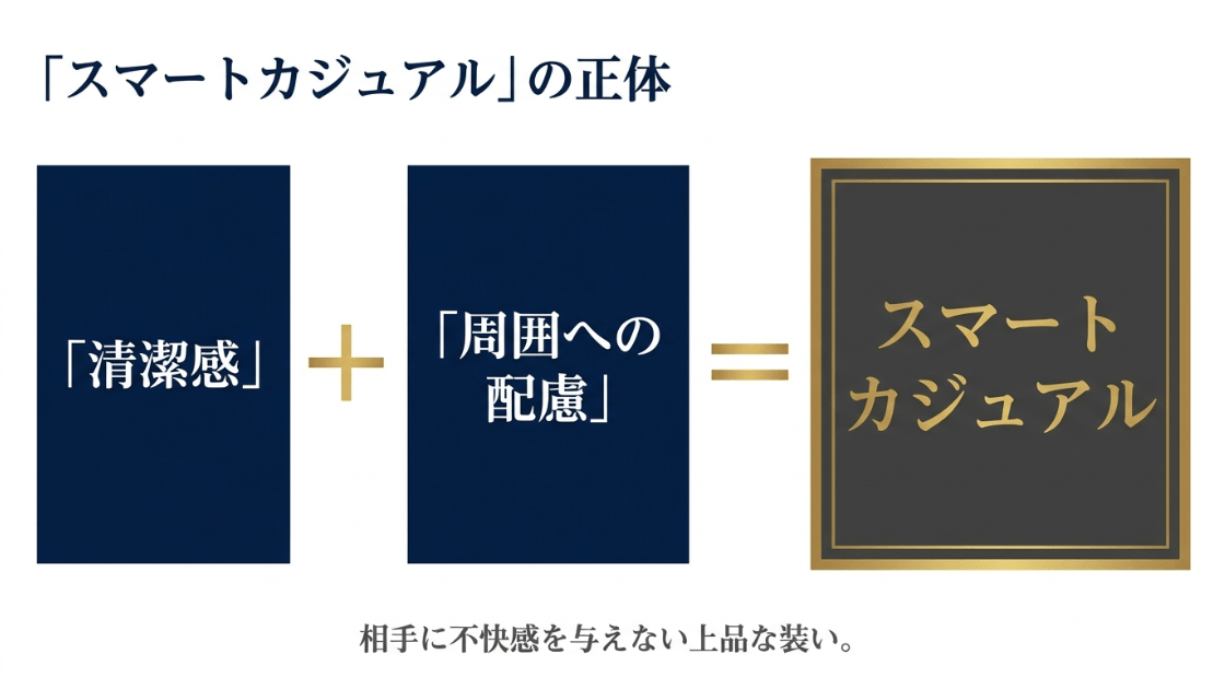 しかし、その本質を一言で表すなら、「相手に不快感を与えない清潔感のある上品な装い」と言い換えることができます。冠婚葬祭のような礼装(フォーマル)ほど堅苦しくなく、かといってTシャツに短パンのような普段着(カジュアル)でもない。その中間にある大人の品位が求められているのです。