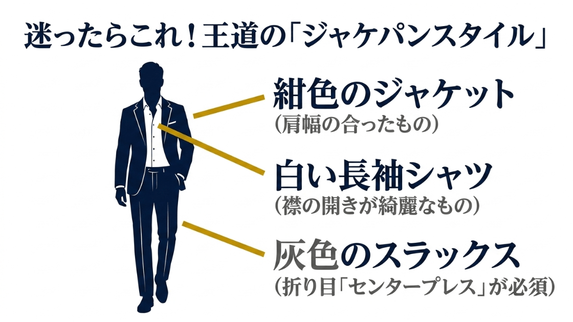 もし迷った時は、この記事でご紹介したネイビージャケットとグレースラックスという王道に立ち返ってみてください。