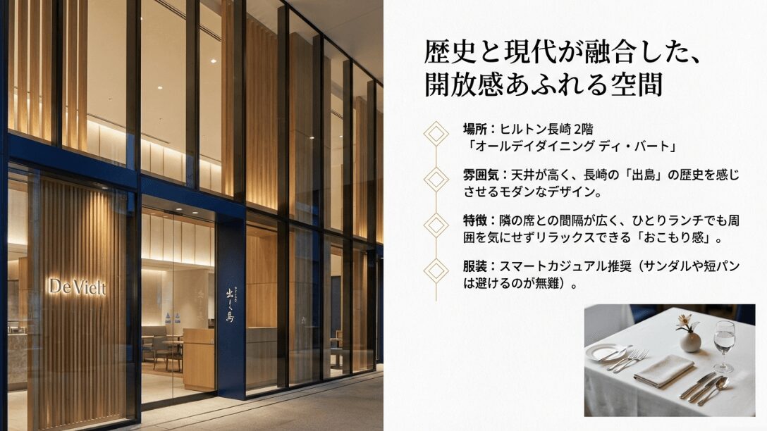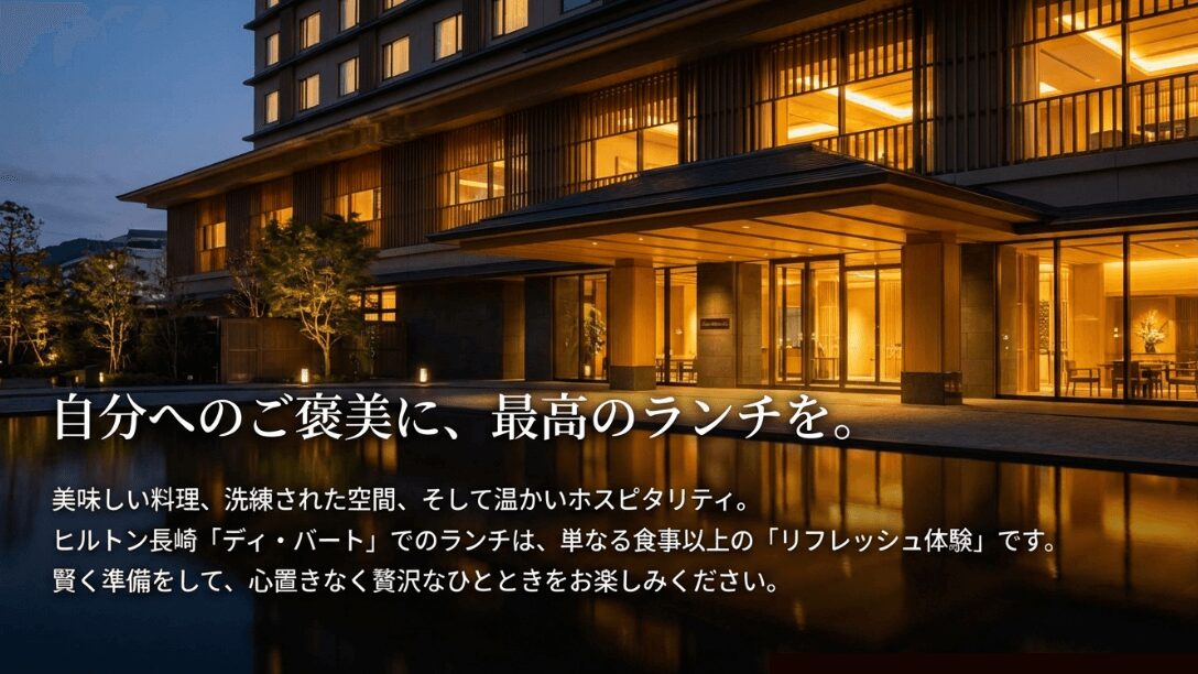 ヒルトン長崎のレストラン「ディ・バート」ランチビュッフェ完全ガイドの表紙スライド。最高のひとり時間を楽しむための魅力と攻略法というタイトル。 レストラン