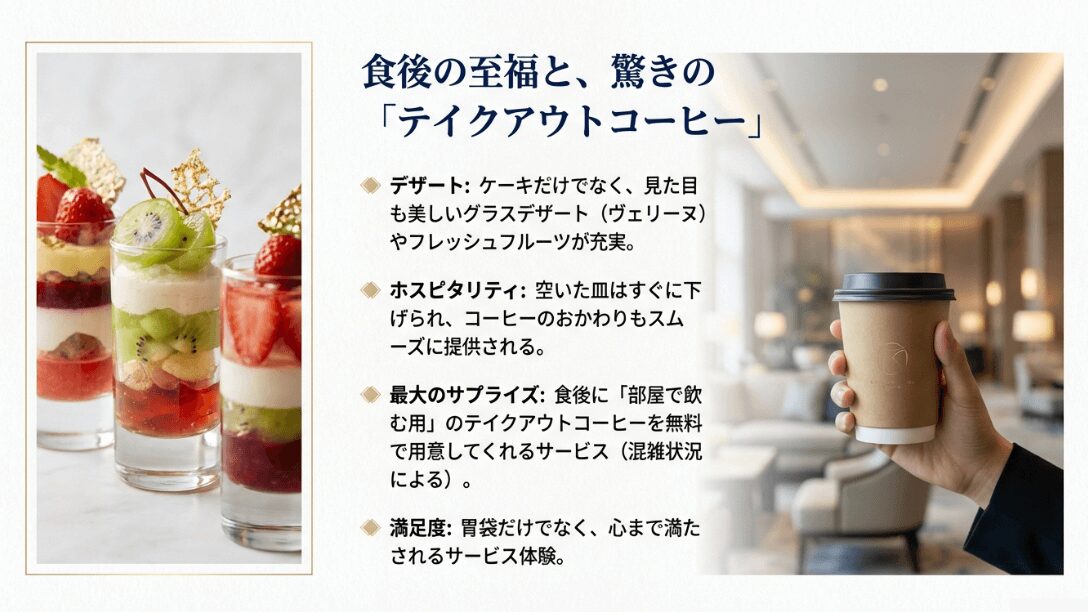 そして、非常に満足度を高めているのが、食後のコーヒーや紅茶を「持ち帰り用カップ」で提供してくれるサービスです。ビュッフェの締めくくりにゆっくりお茶を楽しむのはもちろんですが、その余韻をホテルの外まで持ち出せるというのは、非常に嬉しい心配りですよね。
