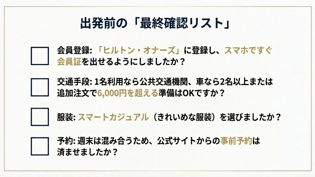 「結局どこで予約するのが一番いいの?」という問いへの答えは、その時のキャンペーン状況によって変わります。しかし、安定して高い満足度を得られるのは、やはり公式サイトからの予約、あるいは直接電話での予約にヒルトン・オナーズを組み合わせる方法です。