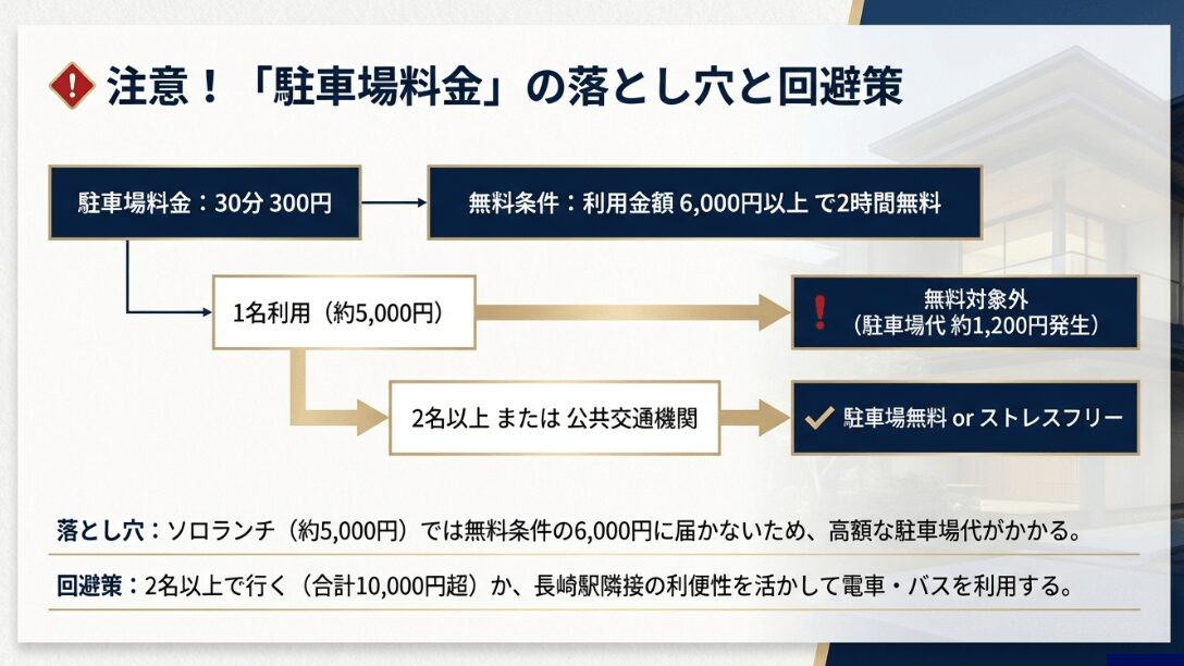 6,000円以上の利用で2時間無料になる駐車場の条件と、ソロランチで無料条件に届かない場合の注意点をまとめた比較スライド。