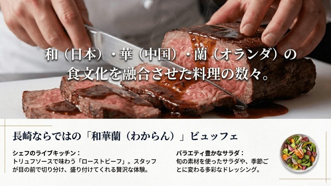 長崎の和華蘭文化を融合させた料理と、トリュフソースのローストビーフを目の前で切り分けるライブキッチンの魅力を紹介するスライド。