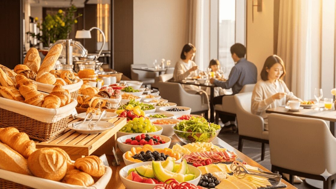 ホテルの朝食ビュッフェの真髄はその圧倒的なメニューの多様性にあります。ヨーロッパから直送されたAOP認定バターが香る焼きたてのクロワッサン、新鮮な地場野菜が並ぶサラダバー、色とりどりのフルーツ…
