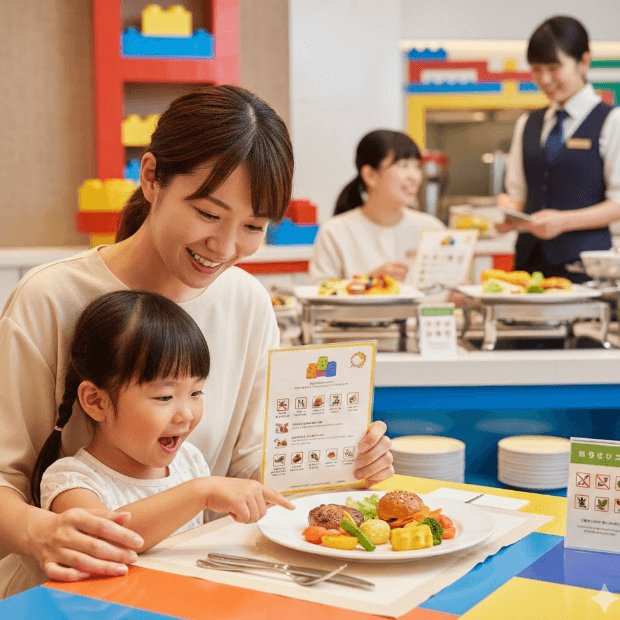 食物アレルギーは人によっては旅行中の外食において最も懸念されるポイントの一つです。レゴランド・ジャパン・ホテルはファミリー層を主なターゲットとしているため、この点に関して非常に積極的かつ慎重な情報開示と対応を行っています。