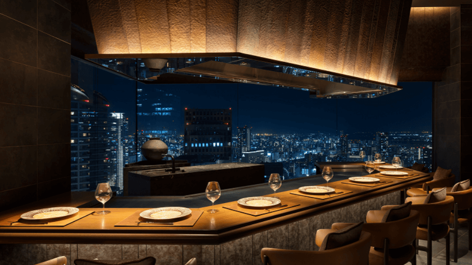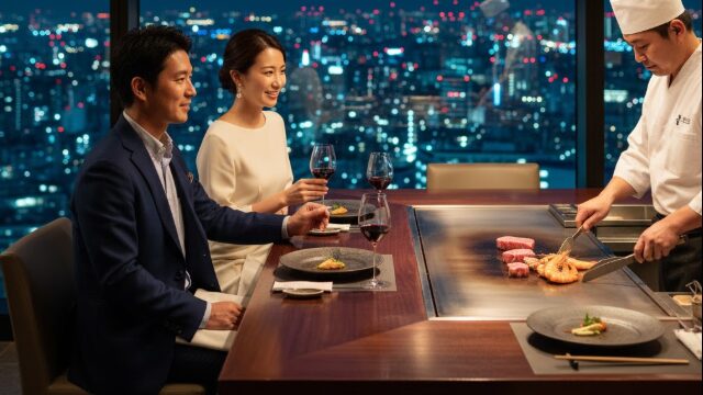 地上140mから見下ろすロマンチックな夜景、高級感と落ち着きに満ちた洗練された雰囲気、そして目の前でシェフが腕を振るう調理のライブ感。これら全ての要素が組み合わさり、二人の大切な時間を忘れられない感動的なものへと演出してくれます。