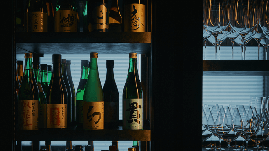 店内は洗練されたダークトーンで統一された、まさに大人のためのシックで落ち着いた空間が広がります。全長約12mにも及ぶ壮観なロングカウンターや、窓を独占できるプライベート感あふれるコーナーカウンターなど、どの席に座っても非日常感を存分に味わえるよう設計されています。