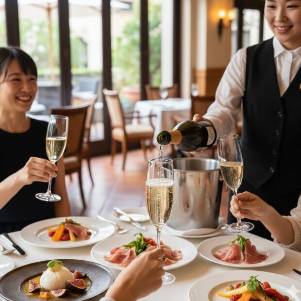 スタッフの方々は常にテーブルの状況を把握しており、グラスの中身が少なくなると、頼む前にすぐに注ぎに来てくれます。ある口コミでは「まるでわんこ蕎麦のようにシャンパンが注がれる」と表現されていましたが、これは決して大げさではないようです。