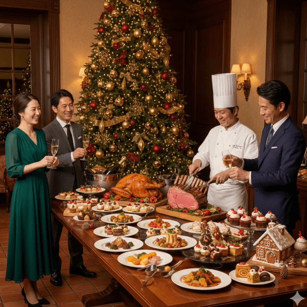 この時期の「フェスティブ・シャンパンブランチ」は、価格が通常より高く設定される(例:15,000円~18,000円程度)ことが多いですが、その分内容はさらに豪華絢爛です。ローストビーフに加えて七面鳥(ターキー)が登場したり、クリスマス限定のスイーツが並んだりと、特別感満載です。