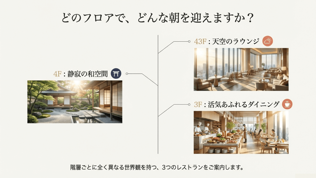 東京ドームホテルの朝食は単なる食事の場を超えて、それぞれが全く異なる「世界観」を持っています。それはまるで、一つのホテルの中に3つの異なる国があるかのようです。