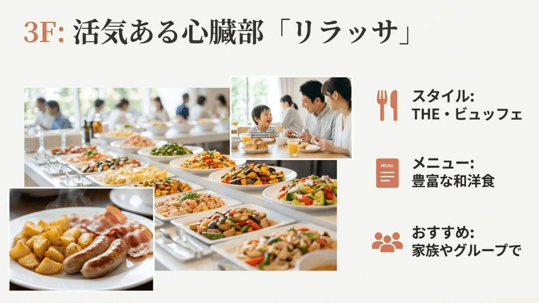 - 3F リラッサ: 「大衆の活気」。ドームシティのワクワク感をそのまま朝食会場に持ち込んだ、エネルギー溢れる場所。