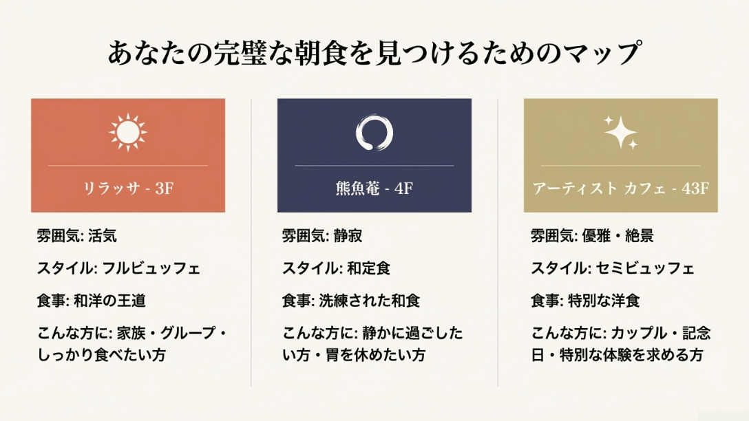 東京ドームホテルの朝食は、単に「和食か洋食か」で選ぶだけでなく、誰とどのような時間を過ごしたいかによって最適な会場は変わります。