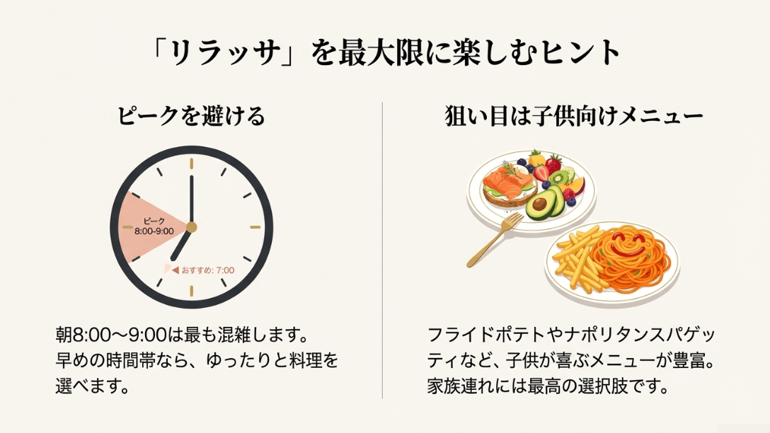 逆に、静かに景色を楽しみたいのにリラッサに行くと、窓の外はドーム周辺の人工地盤レベルで景色は楽しめず、喧騒に包まれてガッカリ…なんてことも。この違いを事前にパートナーや家族と共有しておくことが、朝食選びで失敗しない最大のコツです。