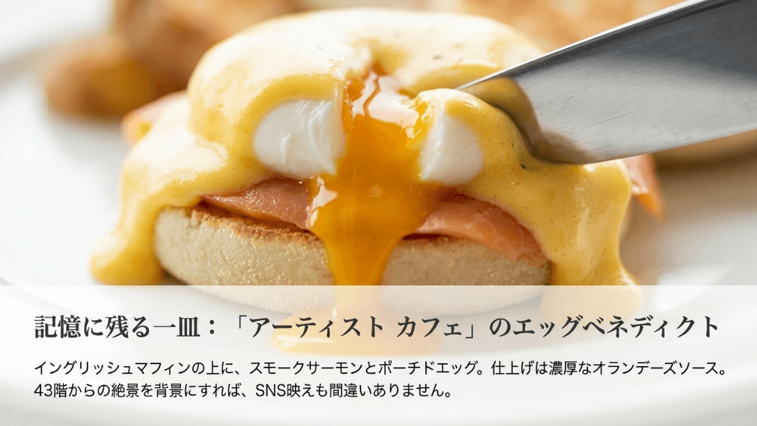 選ばれた宿泊客だけが入れる43階のアーティストカフェ。ここの朝食の主役はなんといってもプリフィックススタイルで選べるメインディッシュです。中でも一番人気は、やはり「エッグベネディクト」でしょう。