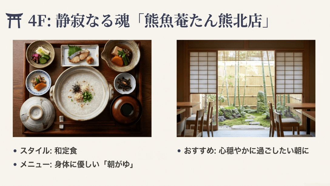 - 4F たん熊: 「伝統の安らぎ」。喧騒から離れ、胃腸と心を整えるための、静寂に満ちた和の場所。